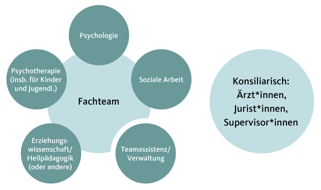 Wie zahlreiche Erhebungen zeigen, arbeiten heute in Erziehungsberatungsstellen vorwiegend Psycholog*innen und Sozialarbeiter*innen/Sozialpädagog*innen (bke, 2022). Weitere anzutreffende Berufsgruppen sind daneben Pädagog*innen/ Erziehungswissenschaftler*innen, Heilpädagog*innen, aber auch Kinder- und Jugendlichenpsychotherapeut*innen. Andere Professionen, wie Soziolog*innen, Theolog*innen oder Kindheitspädagog*innen finden sich eher selten, und Ärzt*innen und Jurist*innen stehen den Stellen häufig nur als Honorarkraft flankierend zur Verfügung. Unabdingbar für das Fachteam ist die Unterstützung durch Verwaltungsfachkräfte unter Berücksichtigung der spezifischen Anforderungen an die Teamassistenz einer Beratungsstelle (vgl. Abb. 1). Fachkräfte in der Erziehungs- und Familienberatung verfügen in der Regel über beraterische und therapeutische Zusatzqualifikationen, vorrangig in etablierten Verfahren wie Systemische Therapie, Verhaltenstherapie sowie tiefenpsychologischen oder humanistischen Therapieverfahren. Manche haben sich für die Behandlung besonderer Zielgruppen, z. B. Trennungs-, Scheidungsfamilien, traumatisierte Personen, Pflegeeltern, Kinder psychisch kranker Eltern, belastete Eltern mit Babys und Kleinkindern oder Betroffene von sexueller Gewalt, weiterqualifiziert (bke, 2022). Weiterhin unterstützen und beraten Erziehungs- und Familienberatungsstellen andere Fachkräfte der Kinder- und Jugendhilfe sowie Lehrer*innen, z. B. in Fragen des Kinderschutzes.